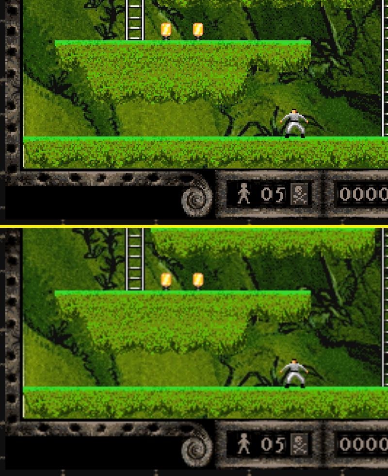 If you prefer more pixelated graphics without bilinear filtering applied, set BilinearFiltering to false in your config file. The below image shows the difference between the two styles. Here are links to the full-sized images of bilinear and non-bilinear screenshots. This setting only applies when the game is running full screen and not in a window.